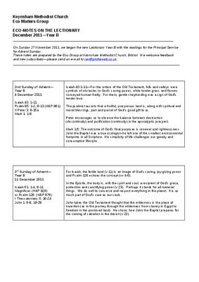 The psalmist asserts that a fruitful, prosperous land is, along with spiritual and moral blessings, part and parcel of God’s good gift to us. Peter encourages us to observe the balance between destruction (discontinuity) and purification (continuity) in the apocalyptic prospect. Mark 1:6: The outcome of God's final purposes is renewal and righteousness. John the Baptist was a true ecologist--he left one of the smallest environmental footprints in all Scripture. His simplicity of life challenges our greedy and consumptive lifestyle...