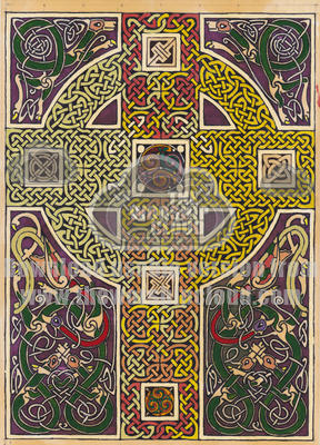 This is a traditional style of celtic cross painted in 1996 by Pete Brazier. Acrylics, ink and yacht varnish on paper.