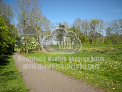 A footpath beside a green expance of grass and wild flowers