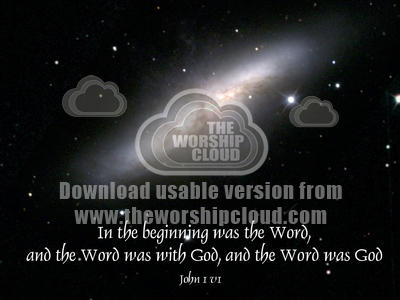 Text John 1 v1 'In the beginning was the word, and the word was with God, and the word was God.' Set against background NASA cosmos universe creation environment stewardship.