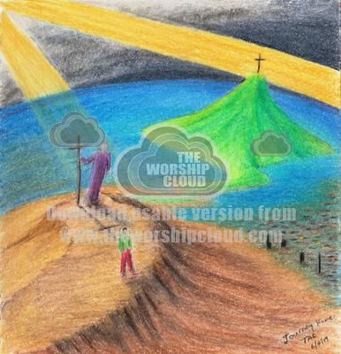 The image shows the church as two people, old and young, looking in different directions. One sees the past and the other looks at the unfolding times (flooding of cities - symbolic of global warming). Mountains symbolise leaders. In a time when we are looking for moral, spiritual and social leadership.