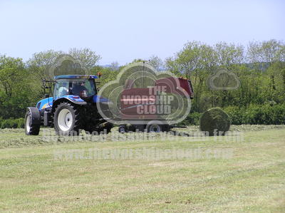 This is the third in a series of photos showing the process of making silage (starting with the grass having been cut in the field). In this photo, the round hay bale has been made within the machine and is now being released out of the back of it.