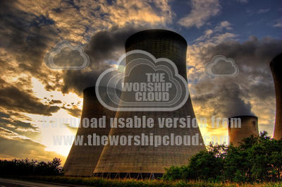 The four eastern cooling towers at the Drax coal-fired power station in North Yorkshire at sunset. There are eight altogether, with another four at the western end.
