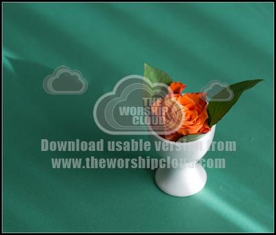 Orange rose in an egg cup with leaves. background green to add words or verse