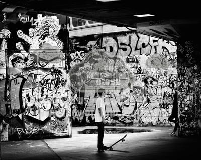 Skateboarder pauses to contemplate shadowy figure at the Southbank