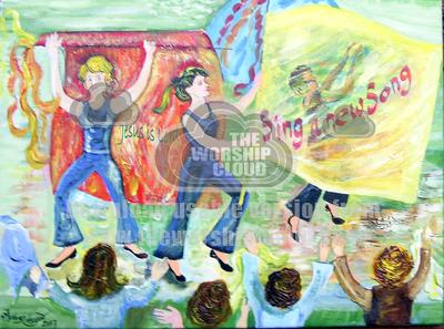 Flag Dancers at Spring Harvest Skegness painted by Audrey Hogan in acrylic paints. The painting is based on her sketch and memories of Spring Harvest 2005. This is one of set of two so far!