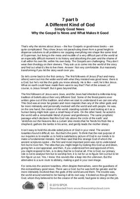 That’s why the stories about Jesus – the four Gospels or good-news books – are quite complicated. They show Jesus not parachuting down from a great height to dispense solutions to all problems nor zapping everything into shape like some kind of Superman, but living in the mess and muddle of a very difficult part of the world at an especially difficult moment in its history and absorbing the pain and the shame of it all within his own life, within his own body. The Gospels are challenging. They don’t wear their theology on their sleeves. They ask us to come into the world of the story and find out what it’s like to live there. Answer: Not very comfortable. But massively transforming if you let the story wash over you..