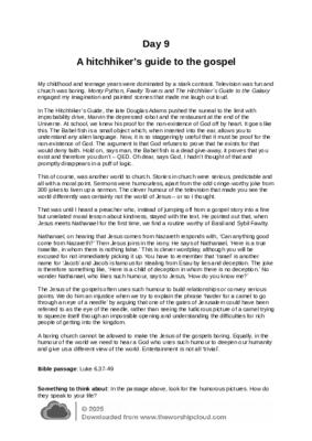 Thoughts taken from TV, Books and life experiences on various topics and given a Christian slant to stimulate thoughts. The topic here for Day 9 is 'Television Fun, Church Boring', looking at the likes of Monty Python and The Hitchhiker's Guide To The Galaxy. Bible reading: Luke 6:37-49