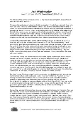 This reflection has been successfully used as a short (978 words)sermon. It examines the background to the ashing ceremony and indicates how the Lent period which follows is one of both hope and challenge. With adaption it could also be used in the first Sunday in Lent.