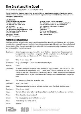 Each of the following sketches (scenes) can be used to form the basis for a complete act of worship or used as individual scenes on separate occasions. Each scene will require a narrator to read the linking text as well as the characters in the scene itself.