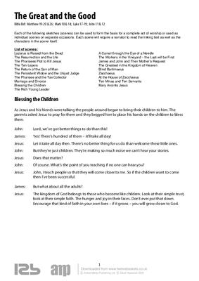 Each of the following sketches (scenes) can be used to form the basis for a complete act of worship or used as individual scenes on separate occasions. Each scene will require a narrator to read the linking text as well as the characters in the scene itself.