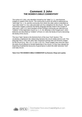 The author of 2 John, who identifies himself as the “elder” (v. 1), uses feminine imagery to speak of the church. The community to which he writes is addressed as “elect lady” (vv. 1, 5), and the community from which the elder writes is identified as “your elect sister” (v. 13)…