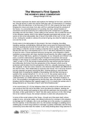The woman expresses her desire and explores her feelings for her lover, and his for her, through stories in which she and he both play roles, as themselves or in fantasy guises. Here she tells three. In her first story (2:8–17), she conjures her lover up by bringing him closer and closer from afar until he is peering through the windows of her house. In a conventional picture of courtship, the man, whose freedom of movement and social autonomy are underscored by the comparison to a gazelle bounding over the mountains, comes calling on the woman, who is inside the house…
