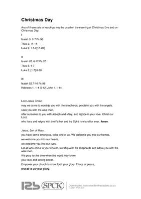 Any of these sets of readings may be used on the evening of Christmas Eve and on Christmas Day: I Isaiah 9. 2-7 Ps.96 Titus 2. 11-14 Luke 2. 1-14 [15-20] II Isaiah 62. 6-12 Ps.97 Titus 3. 4-7 Luke 2. [1-7] 8-20 III Isaiah 52.7-10 Ps.98 Hebrews 1. 1-4 [5-12] John 1. 1-14