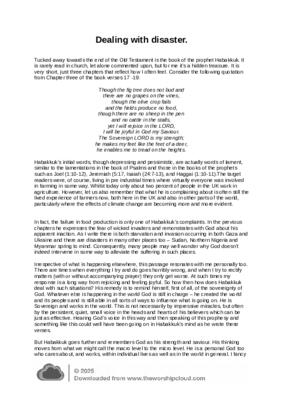This short reflection/sermon considers Habakkuk Chapter 3 where he bemoans at length the disasters facing himself and his people. These are largely related to the disastrous failure of crops. In the earlier chapters he is concerned about the threat of invasion and the lack of action by God. He then offers a way out of the mental and emotional consequences of his brooding on these disasters by recalling the strength and sovereignty of his saviour God leading to a joyful response. This approach is strongly implied in other parts of the New Testament as well as the Old.
