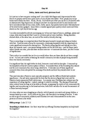 Thoughts taken from TV, Books and life experiences on various topics and given a Christian slant to stimulate thoughts. The topic here for Day 40 is 'The recipe of Community, Solidarity and Christian Love'. Uses Food as a symbol of how we relate as a family or community, and concludes with the food shared at Passover.