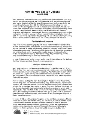 Mark sometimes likes to enfold one story within another (or to ‘sandwich’ it) so as to help his readers to listen to the one in the light of the other. He has done that in the latter part of chapter 3. Within the story of how Jesus’ own family responded to his extraordinary behaviour (3:20–21, 31–35) he has enclosed an altogether more hostile and threatening encounter with some scribes from Jerusalem. What the two stories have in common is that each group is struggling to find ways of making sense of Jesus. They have heard about his remarkable activity, especially about his exorcisms, and, since they cannot simply dismiss the stories as untrue, they need an explanation. Yet neither group yet believes his claim to be working by the power of God. The alternative explanations they come up with are not very flattering: his family think he is mad, and the scribes accuse him of being in league with the devil!…