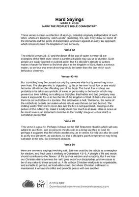 These verses contain a collection of sayings, probably originally independent of each other, which are linked by ‘catch-words’: stumbling, fire, salt. They draw out some of the demands and the perils of discipleship, and warn against an easy, lax approach which refuses to take the kingdom of God seriously…
