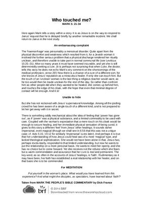Here again Mark tells a story within a story. It is as Jesus is on the way to respond to Jairus’ request that he is delayed briefly by another remarkable incident. We shall return to Jairus in the next study…