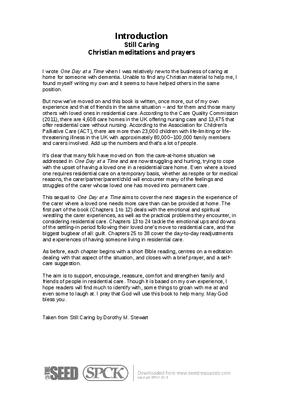 I wrote One Day at a Time when I was relatively new to the business of caring at home for someone with dementia. Unable to find any Christian material to help me, I found myself writing my own and it seems to have helped others in the same position...