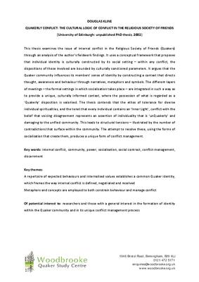 This thesis examines the issue of internal conflict in the Religious Society of Friends (Quakers) through an analysis of the author’s fieldwork findings. It uses a conceptual framework that proposes that individual identity is culturally constructed by its social setting – within any conflict, the dispositions of those involved are bounded by culturally sanctioned parameters. It argues that the Quaker community influences its members’ sense of identity by constructing a context that directs thought, awareness and behaviour through narratives, metaphors and symbols. The different layers of meetings – the formal settings in which socialisation takes place – are integrated in such a way as to provide a unique, culturally informed context, where the possession of what is regarded as a ‘Quakerly’ disposition is valorised. The thesis contends that the ethos of tolerance for diverse individual spiritualities, and the tenet that every individual contains an ‘Inner Light’, conflict with the belief that voicing disagreement represents an assertion of individuality that is ‘unQuakerly’ and damaging to the unified community. This leads to structural tensions – illustrated by the number of contradictions that surface within the community. The attempt to resolve these, using the forms of socialisation that create them, produces a unique form of conflict management.