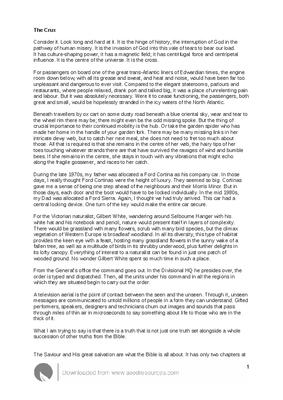 influence. It is the centre of the universe. It is the cross. For passengers on board one of the great trans-Atlantic liners of Edwardian times, the engine room down below, with all its grease and sweat, and heat and noise, would have been far too unpleasant and dangerous to ever visit. Compared to the elegant staterooms, parlours and restaurants, where people relaxed, drank port and talked big, it was a place of unrelenting pain and labour. But it was absolutely necessary. Were it to cease functioning, the passengers,