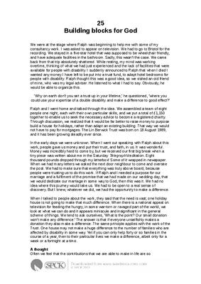 We were at the stage where Ralph was beginning to help me with some of my consultancy work. I was asked to appear on television. We had to go to Bristol for the recording. We stayed in a five-star hotel that was supposed to be wheelchair friendly, and have adequate facilities in the bathroom. Sadly, this wasn’t the case. We came back from that trip absolutely shattered. While resting, my mind was working overtime, thinking of what we had just experienced and the lack of facilities that were available for people with disability. I suddenly announced to Ralph that when I died I wanted any money I have left to be put into a trust fund, to adapt hotel bedrooms for people with disability. Ralph thought this was a good idea, so we visited an old friend of mine, who was my legal adviser. He listened to what I had to say. Obviously, he would be able to organize this...