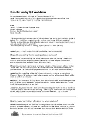 The two couples are in different parts of the acting area, and freeze when the other couple is talking. They could have contrasting styles of dress – eg Jesse & Miriam traditional “Sunday best”, and Demas & Hera flamboyant or very casual. A sign can identify them as in Jerusalem and Antioch respectively. Jesse &Scripts may be held as meeting papers (Jesse) or a letter (Demas).
