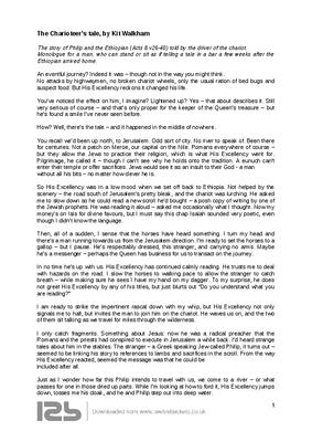 The story of Philip and the Ethiopian (Acts 8 v26-40) told by the driver of the chariot.