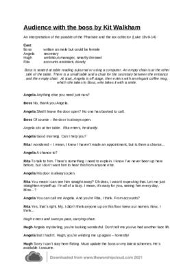 Modern setting of the parable of the pharisee and the tax collector (Luke 18v9-14). Nervous Rita, about confess to fraud, and thrusting executive Hugh, full of his new plans, take advantage of the boss's open door policy.