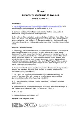 3. The editions of the books that I used were Twilight, First Media Tie-in Edition (New York: Little, Brown & Co., Megan Tingley Books, 2008); New Moon, First Paperback Edition (New York: Little, Brown & Co., Megan Tingley Books,: 2008); Eclipse (New York: Little, Brown, & Co., 2006); and Breaking Dawn (New York: Little, Brown, & Co., 2008)...