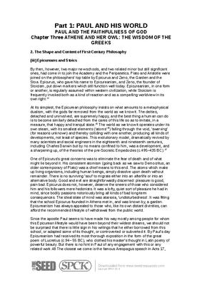 By then, however, two major new schools, and two related minor but still significant ones, had come in to join the Academy and the Peripatetics. Plato and Aristotle were joined on the philosophers’ top table by Epicurus and Zeno, the Garden and the Stoa. Epicurus, who gave his name to Epicureanism, and Zeno, the founder of Stoicism, put down markers which still function well today. Epicureanism, in one form or another, is regularly assumed within western civilization, while Stoicism is frequently invoked both as a kind of reaction and as a compelling worldview in its own right.44...