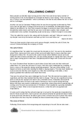 This reflection is based upon Mark 8:34 were Jesus sets out what following him entails. Three main ideas arise from this verse namely the call of Christ, the cross of Christ and the company of Christ. each of these are considered in turn both in terms of the Biblical revelation and human experience. The role of church ceremonies in each of these is indicated.