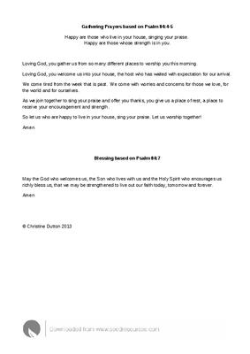 These prayers draw on the words in Psalm 84 - Happy are those whose strength is in you. I often turn up to worship tired from the week before, full of concern for the week that lies ahead. These opening prayers are my attempt to focus at the beginning of worship on the promise that the Lord will strengthen us, that as we come before God to sing his praises, we will be welcomed and find a home. The blessing calls upon God to bless us and strengthen us for the week ahead.