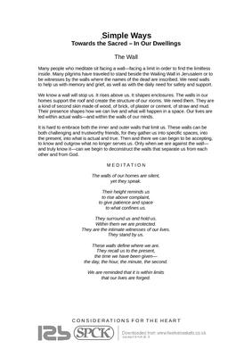 Many people who meditate sit facing a wall—facing a limit in order to find the limitless inside. Many pilgrims have traveled to stand beside the Wailing Wall in Jerusalem or to be witnesses by the walls where the names of the dead are inscribed. We need walls to help us with memory and grief, as well as with the daily need for safety and support.