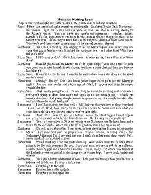 Sketch script. Zaccheus, Nicodemus, Bartimaeus and the Woman at the Well meet up just before going to heaven and compare how Jesus called them