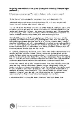 Two sets of footprints stretch back across the wet sand of the beach, leading our gaze towards the dark storm clouds and heavy rain beyond. The direction of travel leads away from the bad weather and indicates that this journey was begun not a moment too soon. This is also a hike made in company; it is not a solitary undertaking but one which relies on companionship. The walkers have been hand-hold close to each other, within whispering distance. This is the biblical picture of God's ongoing pilgrimage with humanity that informs John the Baptist's public ministry. Whisper close, always walking us out of the storm and into the light, God is the close companion who never gives up on us. Through exile and calamity the Bible describes how God keeps faith with the wayward people who collectively so readily lose faith in God's way and fail to progress in God's direction. Yes there is judgement, lots of it. But always there is hope and promise too. The footsteps never diverge: God keeps close even when we travel in a reciprocal direction to the one God intends.