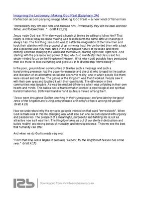 Jesus made God real. Why else would a bunch of blokes be willing to follow him? That reality is critical today because making God real presents the same difficult challenge it always has. The first thing Jesus did was to catch the imagination of the fishermen and hook their attention with the prospect of an immense haul. He confronted them with a task and a goal that was truly man-sized in the outrageous nature of its scope and intent: nothing less than changing the world and themselves, starting right now, right here. And starting with the presence and power of God which so manifestly filled Jesus and his single-minded focus on the Kingdom of Heaven. What else could possibly have persuaded men like these to drop everything and get stuck in to discipleship "immediately"? In the poor, ground-down communities of Galilee such a message and such a transforming presence had the power to energise and direct all who longed for the justice and liberation of an alternative social and economic reality, one in which people like them were valued and set free.