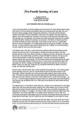 Luke, the expert writer, puts the prodigal son as the third of a set of stories about losing and finding. All of the stories emphasize God’s joy at finding what had been lost, but the story of the prodigal subtly changes the emphasis. The centre of the first two stories is the action of God. God seeks, God finds, God rejoices and calls others to rejoice. But in the prodigal son, the focus of the story is the response of the two sons. The younger son, the prodigal, has to learn the value of what he once took for granted. He sees his father chiefly as a provider, not a person. The father is there to give the son what he wants and then stand back. Even when the son returns in great need, there is a sort of calculation in his rehearsal of what he will say to his father. He does not say, ‘I know my father loves me and will forgive me.’ Instead, he is thinking about his own need for food, and how best to get it...