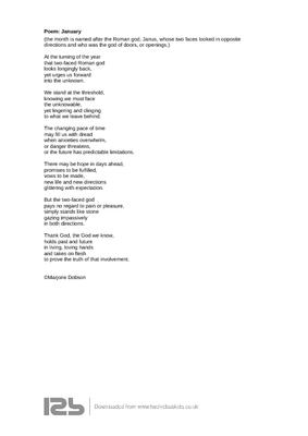 (the month is named after the Roman god, Janus, whose two faces looked in opposite directions and who was the god of doors, or openings.)