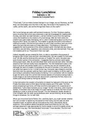 We human beings are pretty self-centered creatures. For their Scripture reading, some churches (like mine) use a lectionary, a set list of passages for reading each Sunday, and when we read Genesis 1, we are inclined to jump from the opening verse (the headline) to the creation of human beings. After all, that’s when the creation story gets really interesting, isn’t it, when it starts being about us. But it’s a big jump from verse 1 to verse 26. The chapter is actually five-sixths over before it reaches humanity. God did not think about us until Friday lunchtime (and you know about the cars that are made on Friday afternoon). This balance in Genesis 1 suggests the real importance of the whole created world—the light and sky, lamps and stars, sea and land, vegetation, sea creatures, birds, and land animals. They are not created just for us. They exist in their own right...