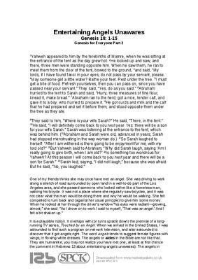 One of my friends thinks she may once have met an angel. She was driving to work along a stretch of road surrounded by open land in a well-to-do part of the Los Angeles area, and she passed someone who looked rather like a homeless man, walking his bicycle. It was not a place where she regularly saw bicycles, and it was not clear what the man would be doing there and why he would be walking. She felt compelled to turn back and (against her usual principle) to give him some money. When he looked at her through the driver’s window “his eyes were radiant—glowing, almost,” she said. “As I drove on to work I said to myself, ‘That was an angel.’ And I felt a bit shaken up.”...