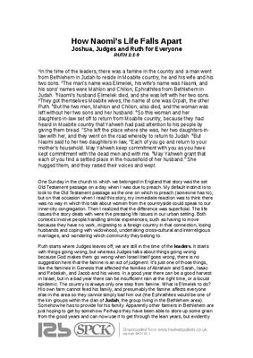 One Sunday in the church to which we belonged in England that story was the set Old Testament passage on a day when I was due to preach. My default instinct is to look to the Old Testament passage as the one on which to preach (someone has to), but on that occasion when I read this story, my immediate reaction was to think there was no way in which this tale about women from the countryside could speak to our inner-city congregation. Then I realized that the difference was superficial. The life issues the story deals with were the pressing life issues in our urban setting. Both contexts involve people handling similar experiences, such as having to move because they have no work, migrating to a foreign country in that connection, losing husbands and coping with widowhood, undertaking cross-cultural and interreligious marriages, and wondering which community they belong to...
