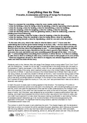 Relatively early in the Vietnam War, folk singer Pete Seeger wrote a song called “Turn! Turn! Turn!” with the closing line, “I swear it’s not too late.” Everything else in the song comes from the poem in Ecclesiastes 3, lightly rearranged. In the 1960s, when the war was escalating, the Byrds made the definitive recording of the song, which reached number one in the United States, though made only