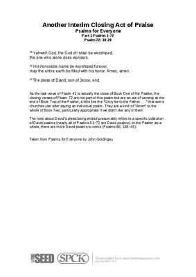 As the last verse of Psalm 41 is actually the close of Book One of the Psalter, the closing verses of Psalm 72 are not part of this psalm but are an act of worship at the end of Book Two of the Psalter, a little like the “Glory be to the Father . . .” that some churches use after saying an individual psalm. They are a kind of “Amen” to the whole of Book Two, particularly appropriate if we didn’t like any of them...