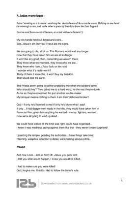 Judas 'standing at a distance' watching the death throes of Jesus on the cross. Holding in one hand (or miming) a coin, and in the other a piece of bread (as from the Last Supper).