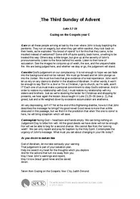 Gaze on all these people arriving at last by the river where John is busy baptizing the penitents. They run on eagerly, but when they get within earshot, they rock back on their heels, as he explodes ‘You brood of vipers!’ Is it for this that they came, to be insulted instead of welcomed? Some drift off quite quickly, back home, unwilling to be treated this way. Others stay a little longer, but give up at the severity of John’s pronouncements. Listen to the force behind his words. Listen to their tone of accusation. See the images he conjures up of wrath, the axe, and the unquenchable fire. We are being judged here, and whether we stay or go, the judgement will stand...