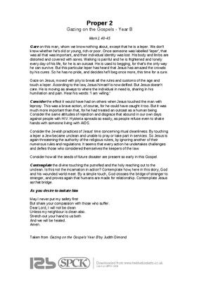 Gaze on this man, whom we know nothing about, except that he is a leper. We don’t know whether he’s old or young, rich or poor. Once someone was labelled ‘leper’, that was all that was important, and their individual identity was lost. His body and limbs are distorted and covered with sores. Walking is painful and he is frightened and lonely every day of his life, for he is an outcast. He is used to begging, for that’s the only way he can survive. But this particular leper has heard that Jesus has amazed the crowds by his cures. So he has no pride, and decides he’ll beg once more, this time for a cure...