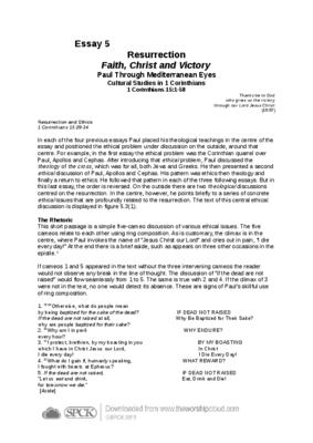 Paul, Apollos and Cephas. After introducing that ethical problem, Paul discussed the theology of the cross, which was for all, both Jews and Greeks. He then presented a second ethical discussion of Paul, Apollos and Cephas. His pattern was ethics then theology and finally a return to ethics. He followed that pattern in each of the three following essays. But in this last essay, the order is reversed. On the outside there are two theological discussions centred on the resurrection. In the centre, however, he points briefly to a series of concrete ethical issues that are profoundly related to the resurrection. The text of this central ethical discussion is displayed in figure 5.3(1)…