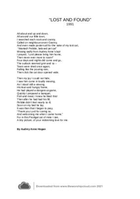 Lost and found is all about my desperate searching for my lost cat and how I rejoiced when he returned.The event became a living parable to me of how God Loved me and brought me home welcoming me as I had my cat.